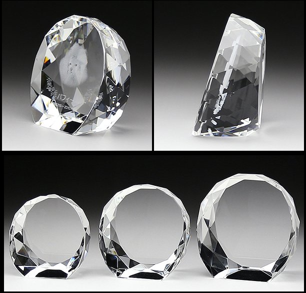 ◆高さ17.5×幅9×奥行4.5㎝ 16,000円 ◆中:高さ13×幅7×奥行3.5㎝ 11,000円 ◆小:高さ10.5×幅6×奥行2.5㎝ 8,800円 ホログラム加工あり (本体、彫刻料、個別箱込、税抜) 写真切り抜き料:無料(ただし修正が必要な場合は、別途料金がかかる場合があります。) |